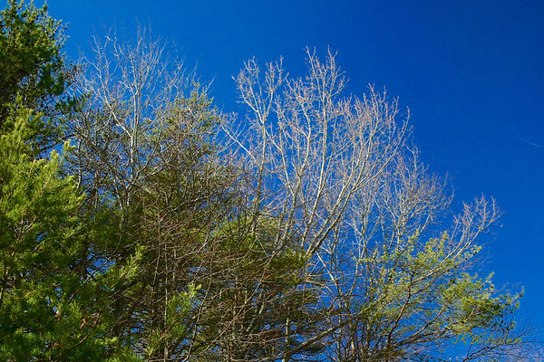 There's no mistaking a white pine (Pinus strobus, Pinaceae) The triangular profile, the tiers of whorled branches, and the bluish green needles are all giveaways. The lower branches don't die off and always go almost to the ground. If you plant one, give it a sixty foot circle! (White County)